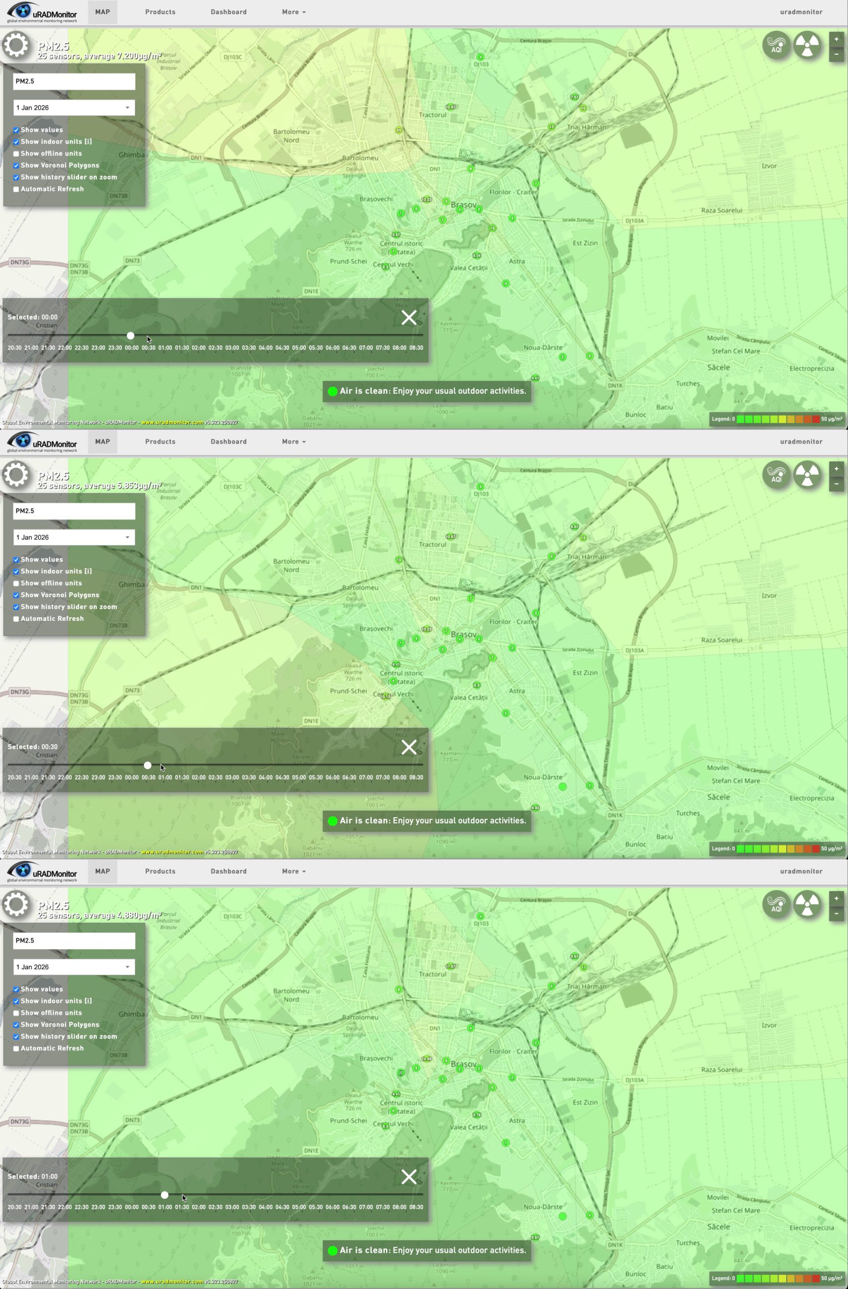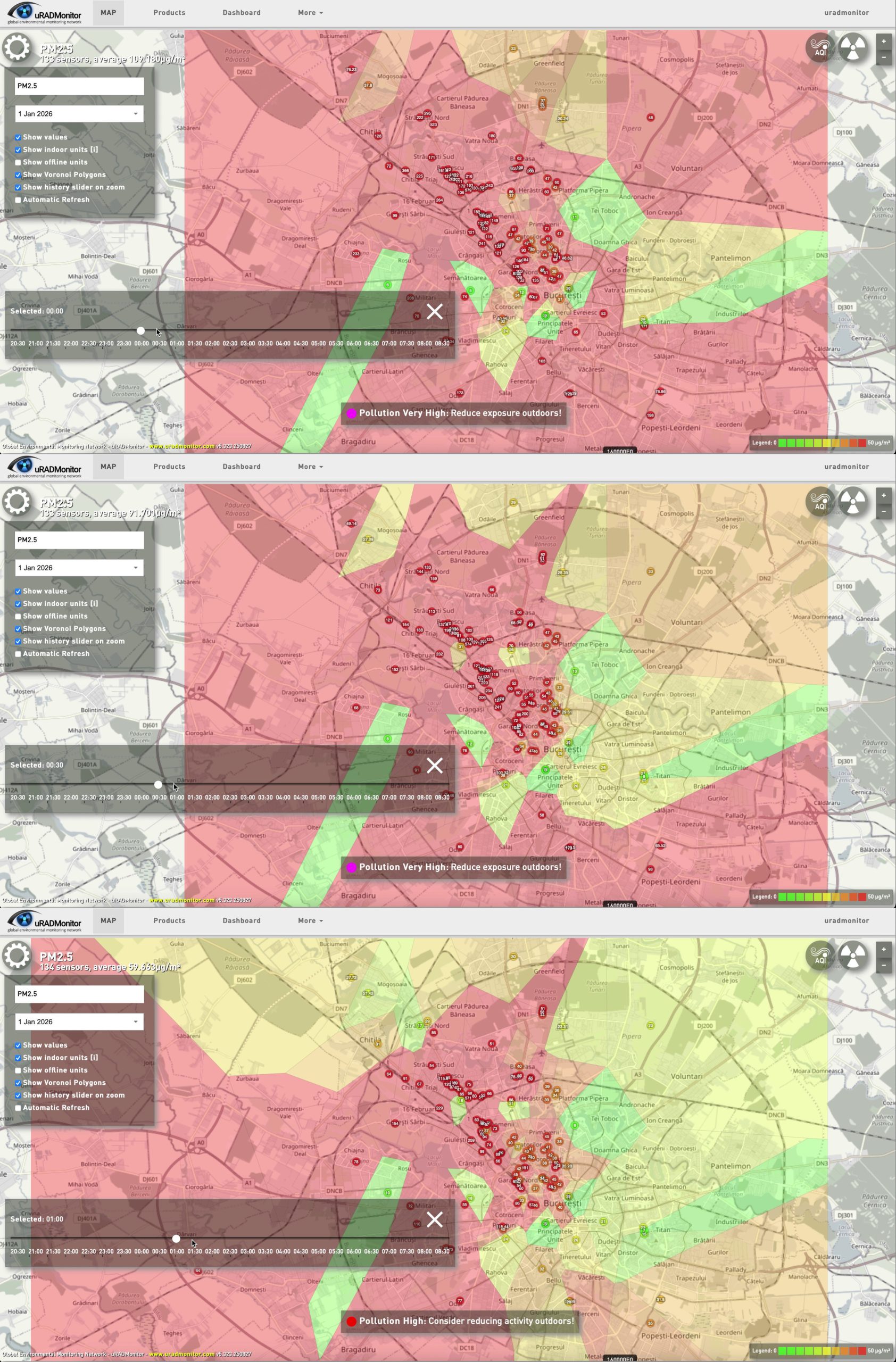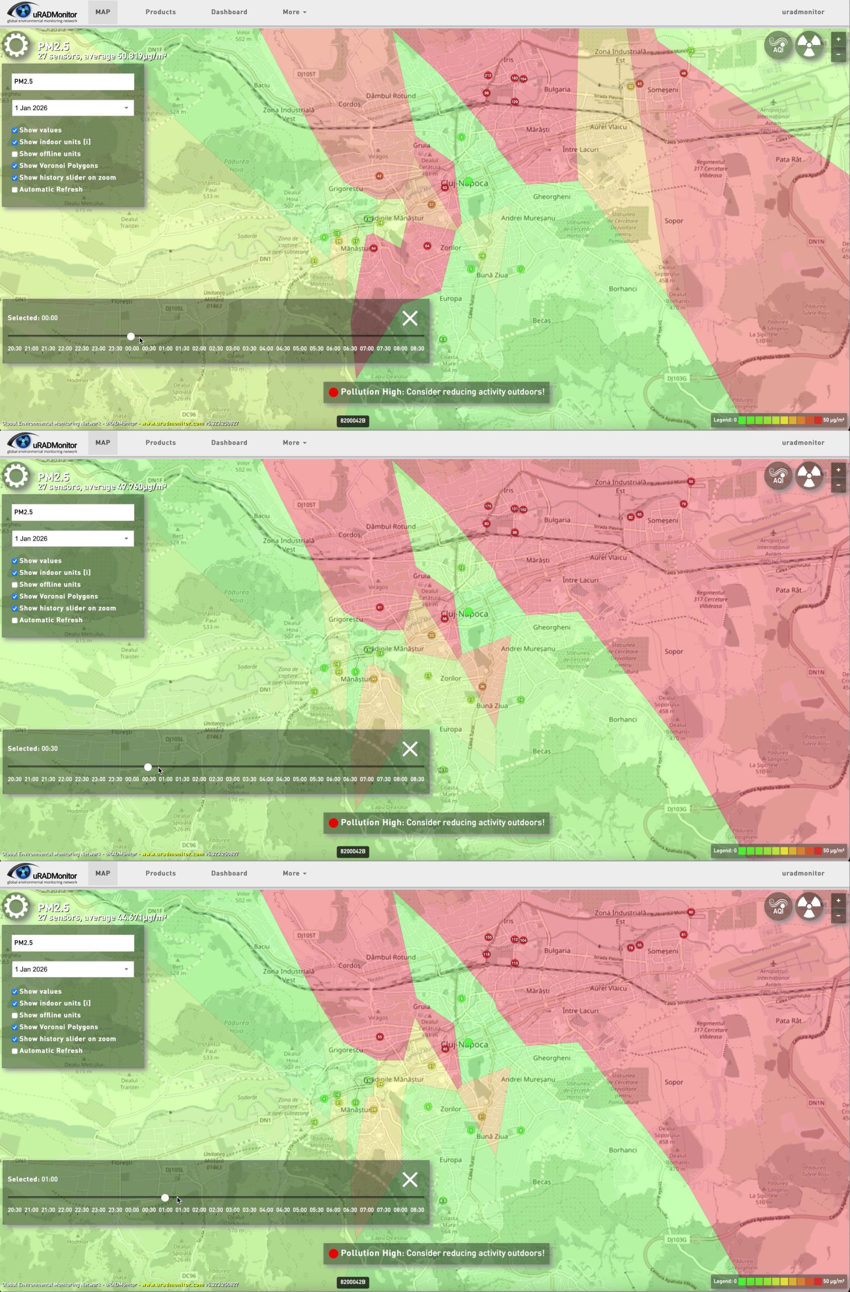 For New Year’s Eve 2025–2026 in Romania, we examined data from the dense network of sensors across major cities. Some (including Brașov, Cluj-Napoca, and others) replaced official fireworks with laser, light, or drone shows to reduce pollution and protect wildlife, while cities that retained fireworks (or allowed widespread private use) showed typical particulate surges.