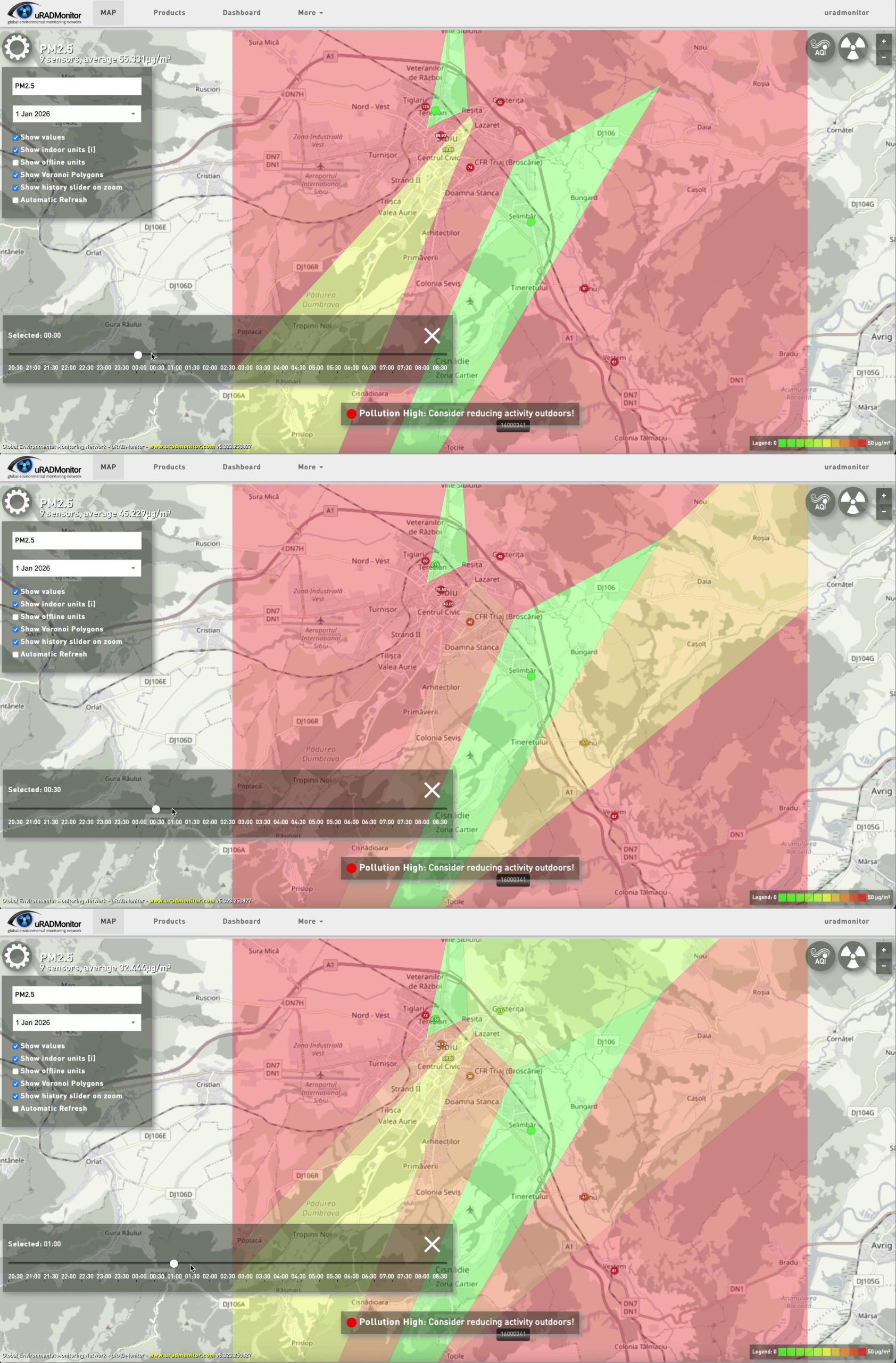 We collected data from Bistrita, Brasov, Bucharest, Cluj Napoca, Craiova , Iasi , Ploiesti and Sibiu. Below is their policy on fireworks use, half of them used them, the other half replaced them with alternatives. The datasets show the midnight (00:00), and the next two subsequent readings at 30 minutes apart:
